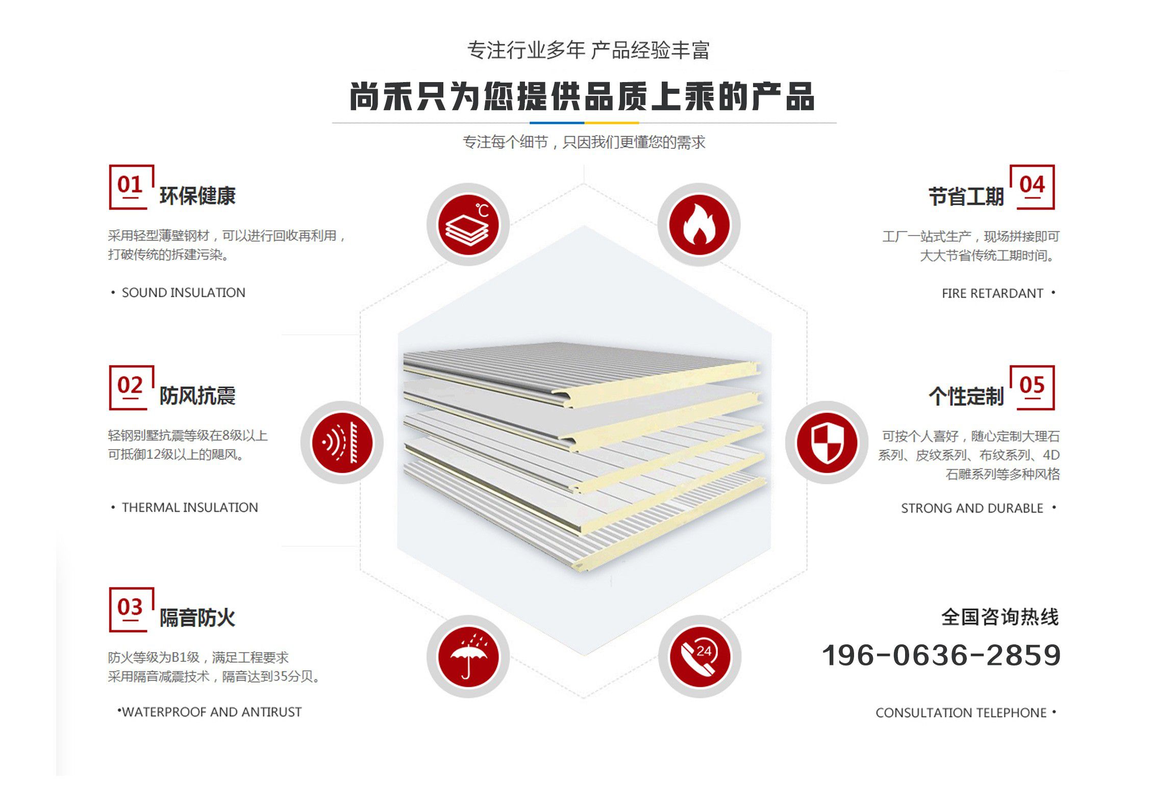 山東尚禾經貿有限公司是集板材設計、研發、生產、施工、一體化的科技公司,并在同行業中率先通過了質量、環境、安全管理體系認證。公司2011年投入資金2000余萬元引進世界先進的聚氨酯節能板連續生產線、意大利進口發泡系統,采用六組份在線自動操作混合澆注技術,在線一次性完成社會配料中心或工廠的配比混合工藝,并可以根據溫度在線自動調整,從而生產處與眾不同的高強度、節能型、綠色環保的聚氨酯夾芯板。(其使用年限高于同行業其他品牌5-10年)  公司主要經營范圍包括聚氨酯夾芯板,PU夾芯板,冷庫板,潔凈板,聚氨酯冷庫板,冷庫保溫板的設計、生產、銷售、技術指導、安裝及一體、以及進出口業務,是中部六省最大的綠色節能建材生產基地。聚氨酯夾芯板年產200萬平方米、PU夾芯板、冷庫保溫板500萬平方米、鏈整產業綜合實力,開創了六省至中西部創新型中小名企總部基地,并將著力推進中國中西部地區集成房屋住宅產業化發展進程?! 】萍紕撔?、節能典范。千萬間始終秉承“誠信、合作”的企業文化精髓,長期致力于鋼板材結構節能建筑產業,愿與社會各界攜手合作,共鑄綠色、環保美好未來。 產品具有良好的絕熱、阻燃、隔音、環保、耐久性能,可廣泛應用于工業、商用建筑內外墻、以及民用建筑外墻保溫、空調通風系統、專用防火保溫門等領域。  我們始終秉承...
